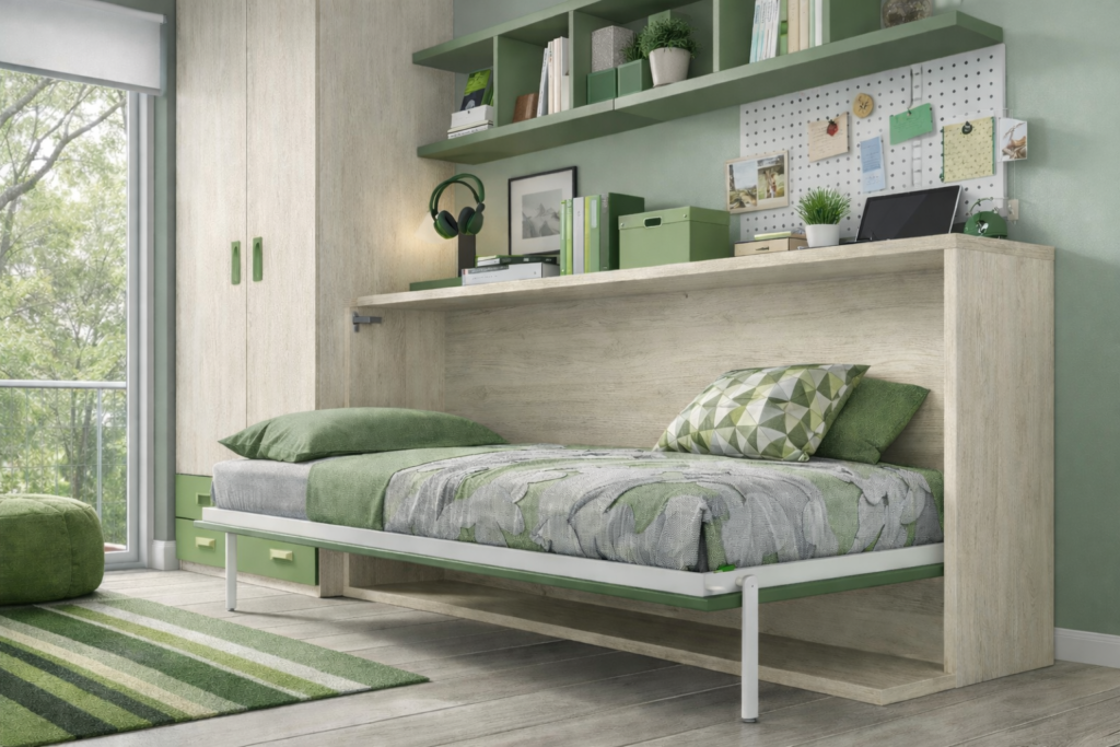- Si necesita zona de escritorio fija elige modelos con escritorio abatible incorporado. La cama se recoge y el escritorio queda disponible sin mover nada. Ideal para estudiar, dibujar o usar el ordenador.